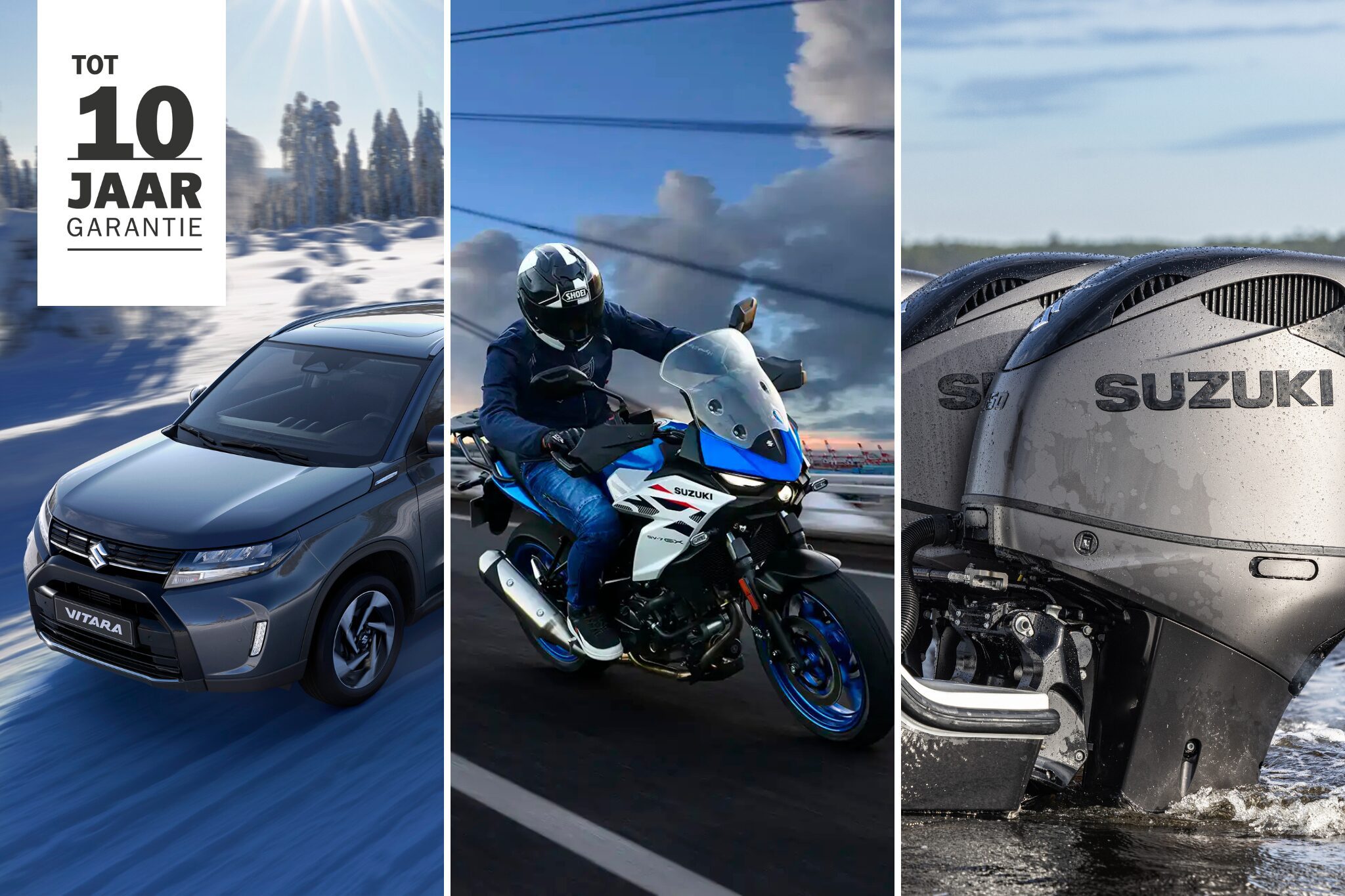 Voor alle nieuwe Suzuki-modellen gold tot nu toe een garantietermijn van 6 jaar: 3 jaar fabrieksgarantie, aangevuld met 3 jaar garantie vanuit Suzuki Nederland. Deze garantieperiode wordt nu tot 10 jaar voor alle Suzuki producten. Vanaf het derde jaar kan de garantie jaarlijks worden verlengd tot maximaal 10 jaar. De verlenging is eenvoudig: na iedere onderhoudsbeurt bij een officiële Suzuki (Service)-dealer wordt één jaar extra garantie toegekend, mits het onderhoud volgens fabrieksvoorschriften is uitgevoerd, eventuele gebreken zijn hersteld en originele onderdelen zijn gebruikt.